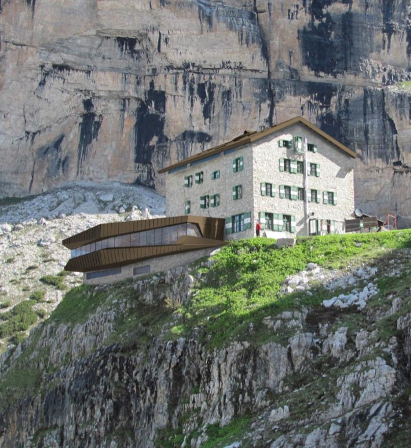 Il rifugio può ospitare per la notte 120 persone, per pranzo, al massimo 60, con la necessità di fare dei turni. Con questa nuova soluzione progettuale si risolverà questa situazione e gli alpinisti potranno godere di panorami mozzafiato anche mentre mangiano. Queste e le altre modifiche previste al rifugio preesistente comporteranno un aumento di volume di circa 700 metri cubi. Il progetto ha già incassato il parere favorevole del Parco Naturale Adamello Brenta, della Comunità delle Regole Spinale Manez e del Comune di Tre Ville e i committenti sperano di partire già con i lavori quest'anno.